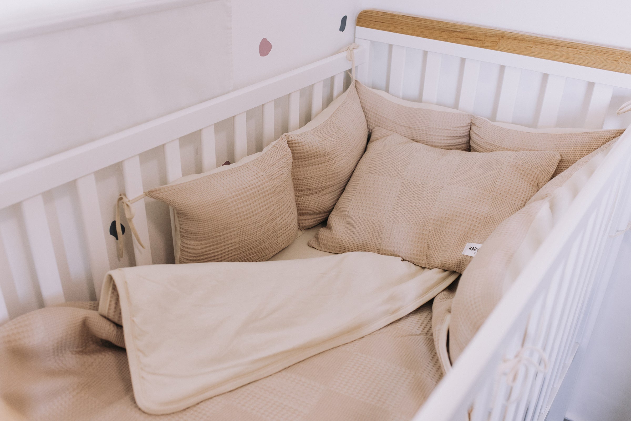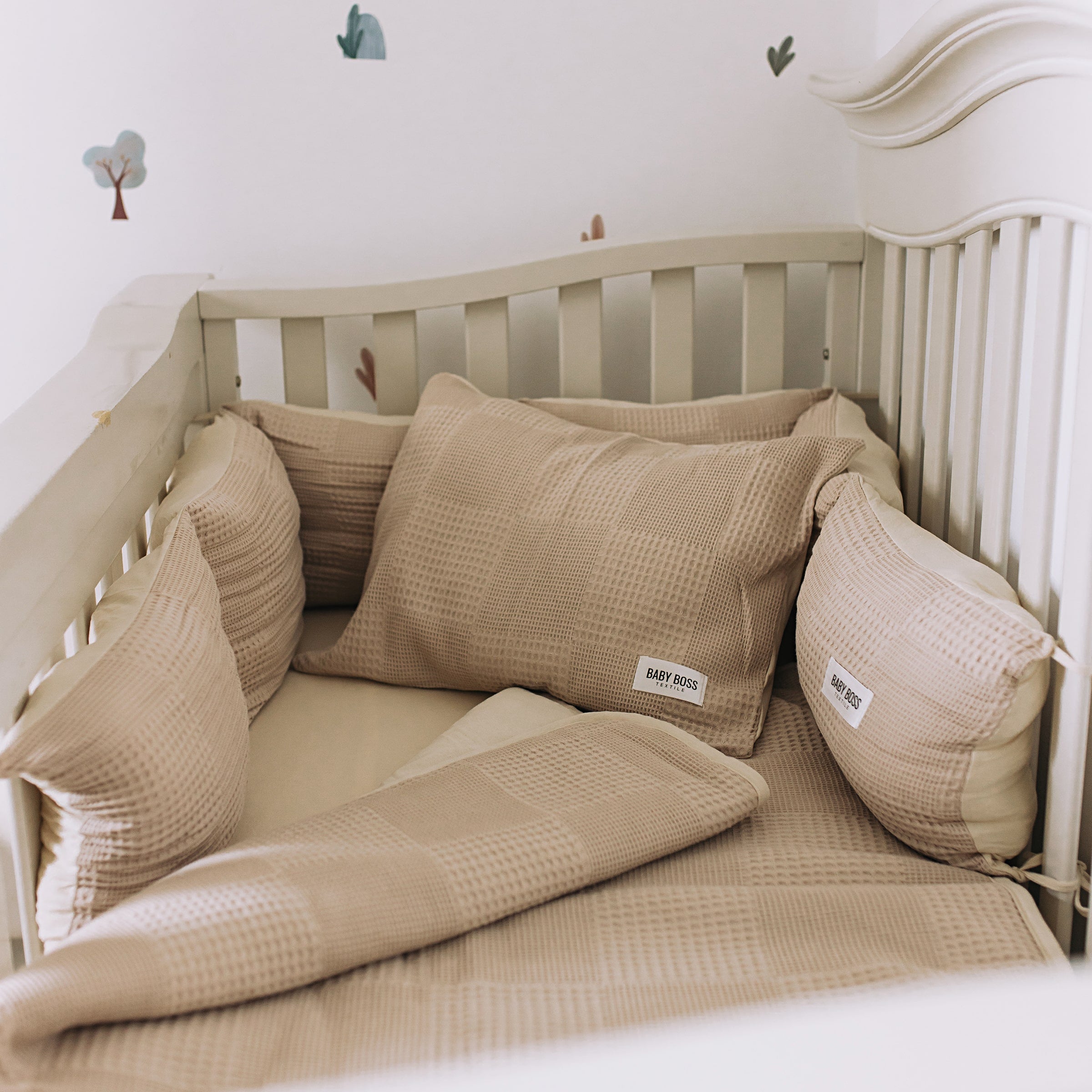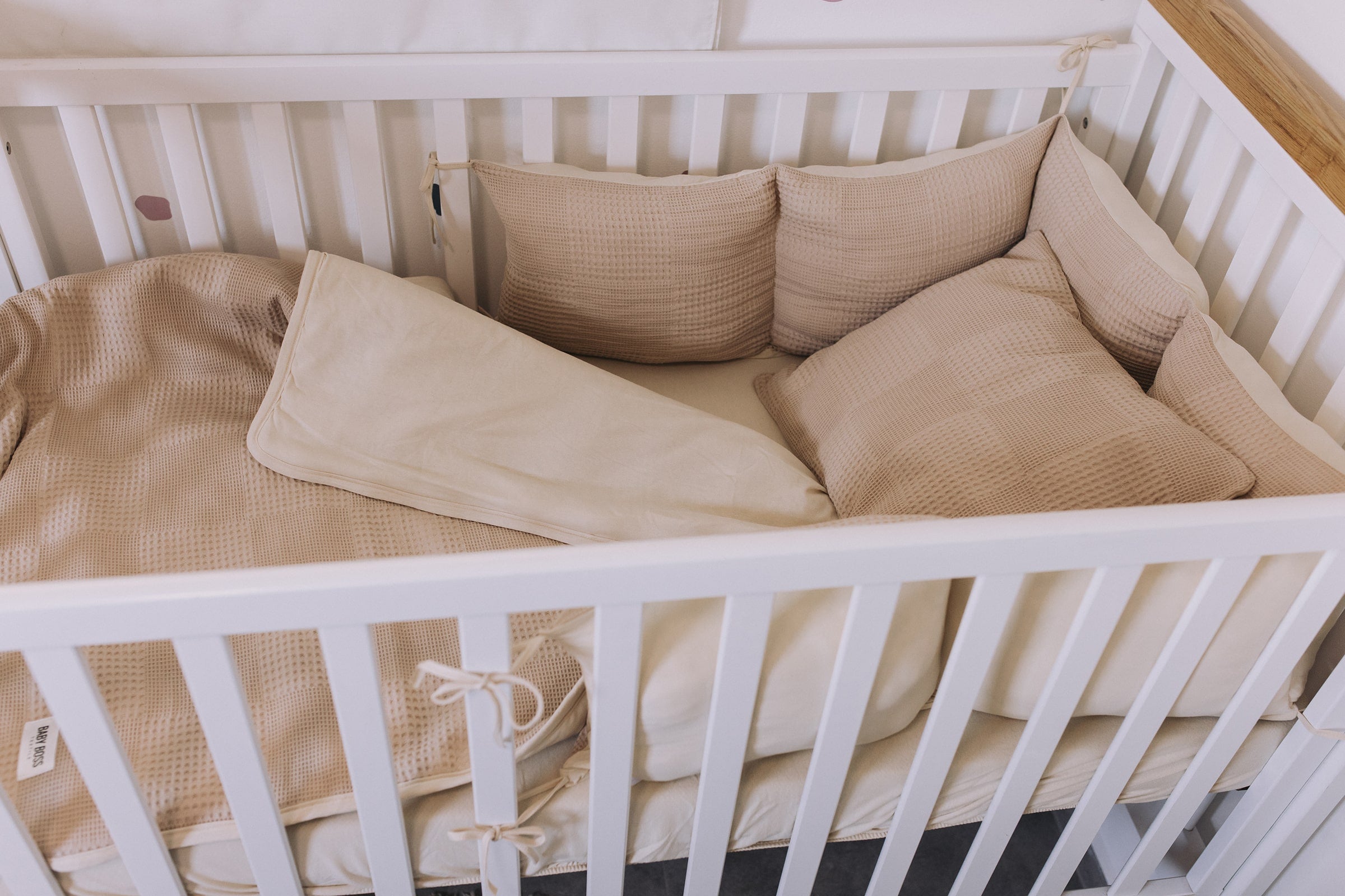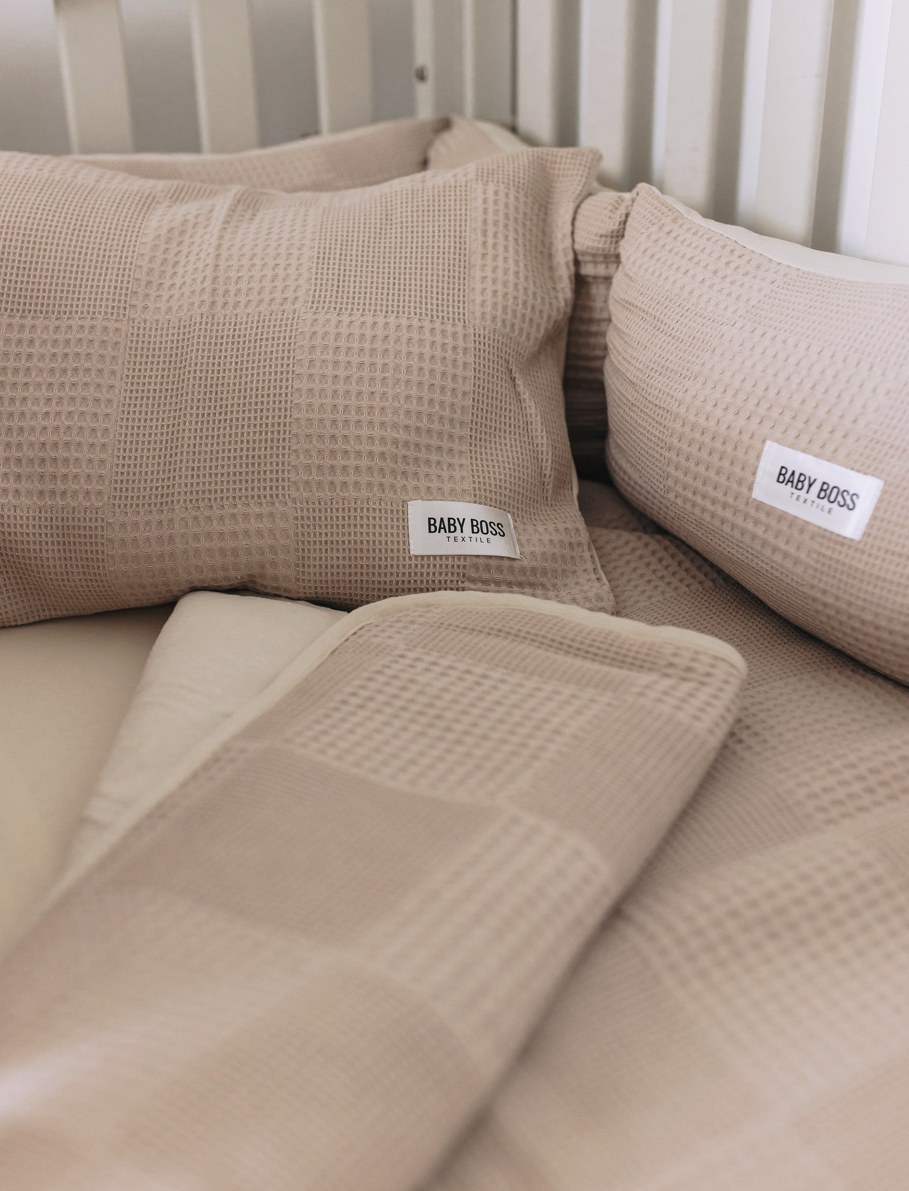 מצעים למיטת תינוק סט בד פיקה ריבועים וג׳רסי - צבע מוקה