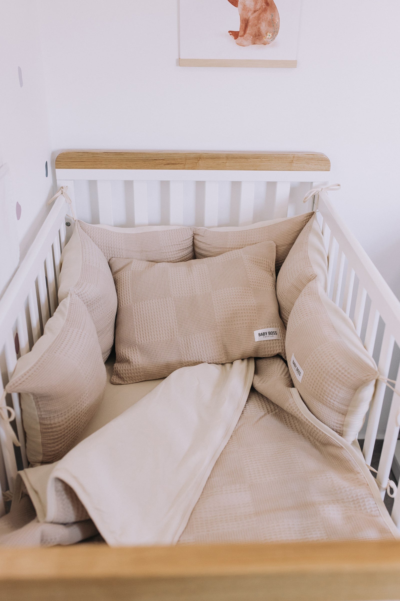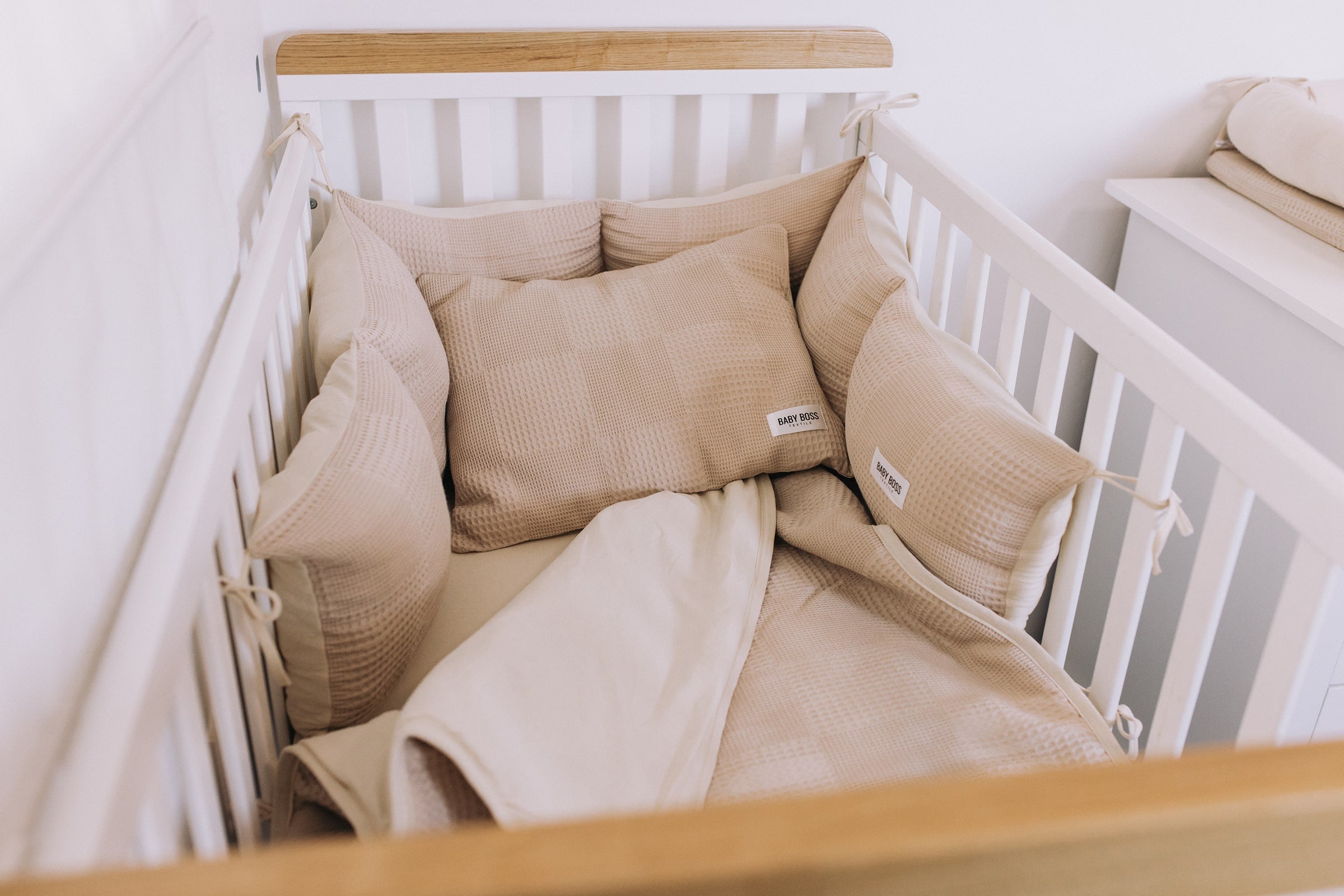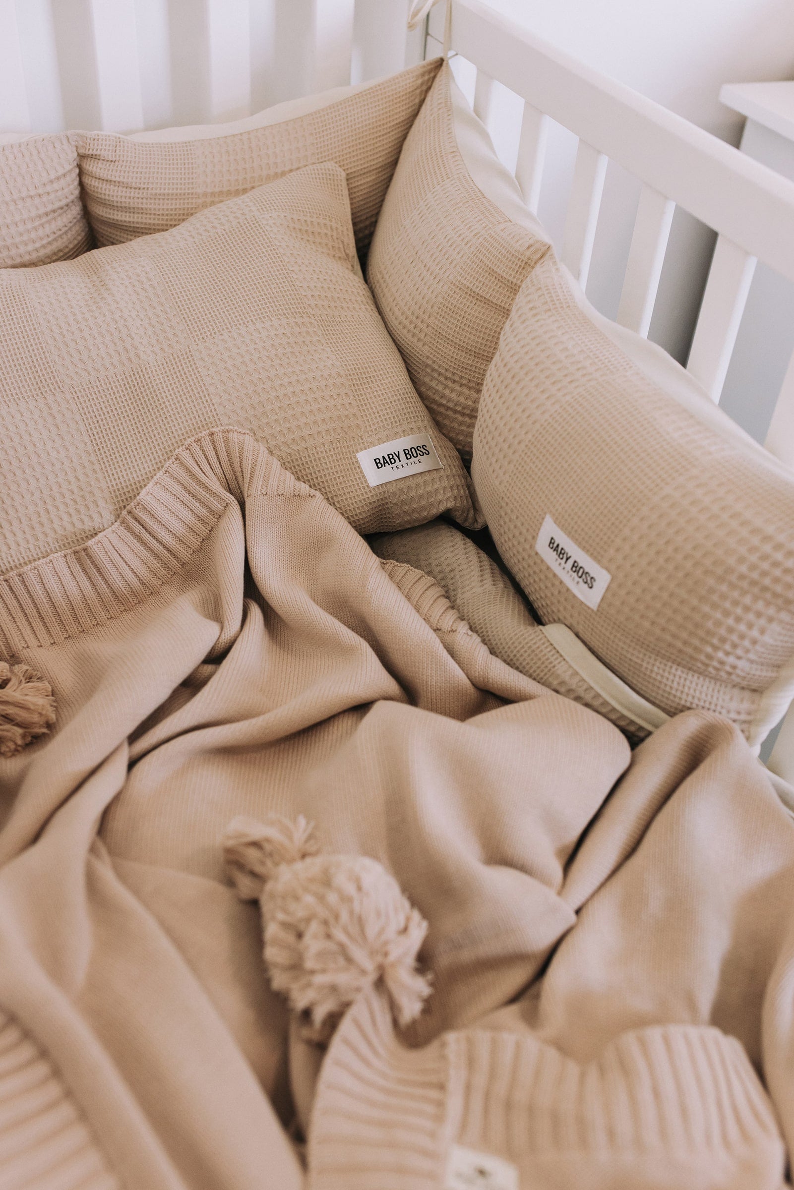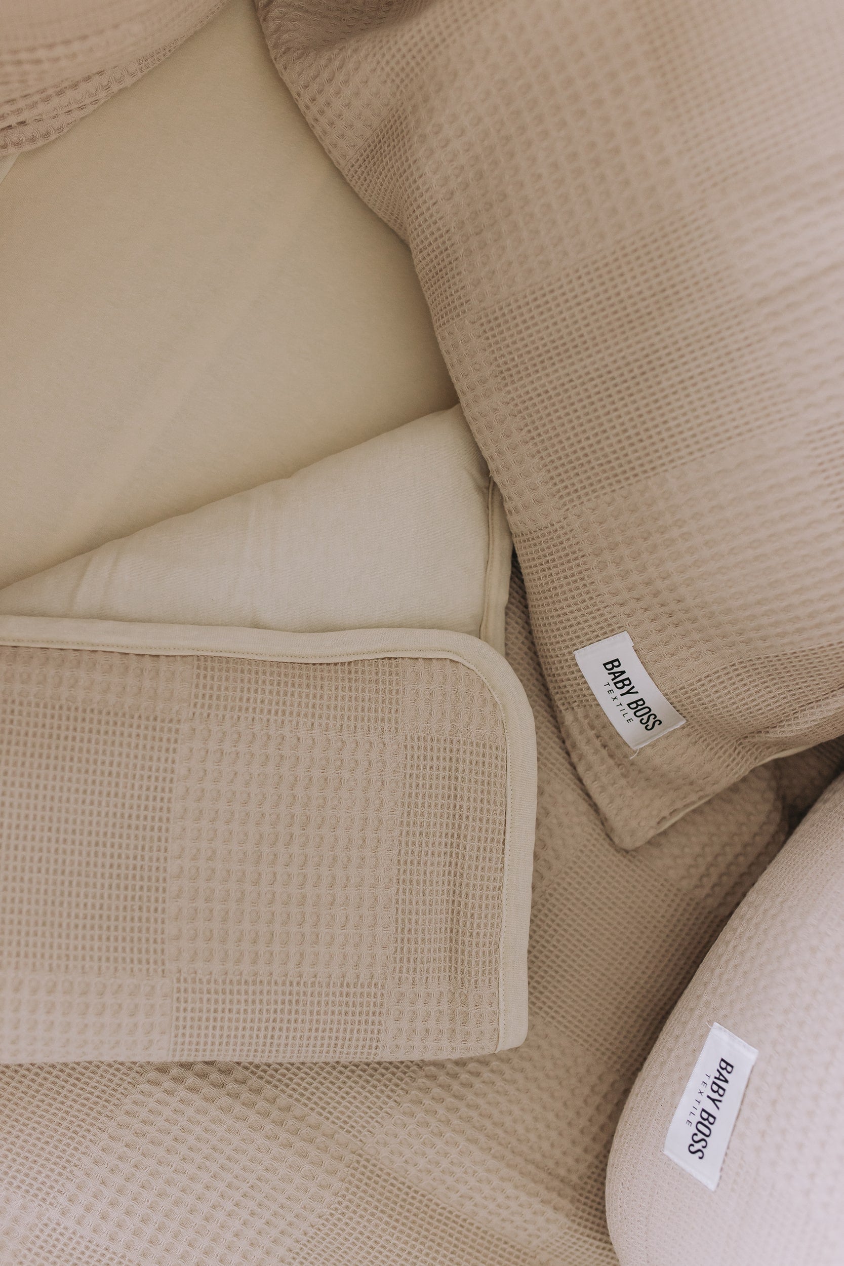 מצעים למיטת תינוק סט בד פיקה ריבועים וג׳רסי - צבע מוקה